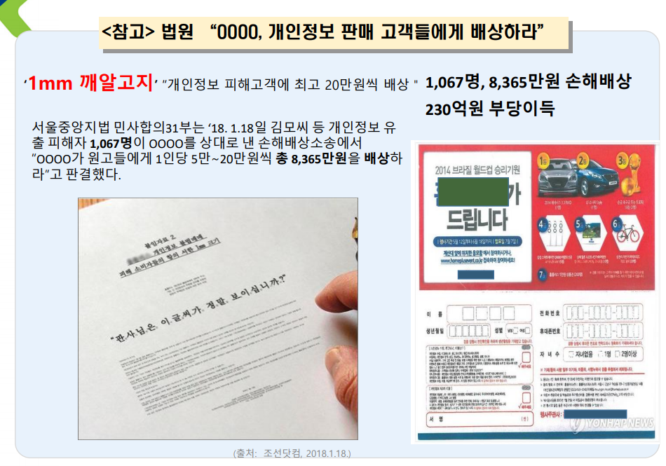 "당신의 정보를 보험회사에게 판매 하겠습니다"라고 동의했으나 글자가 너무 작고 정보주체를 우롱하는 행위다라고 판단해서 배상 판결이 났다. 그런데 행정부에서 이러한 사건이 발생하자 시행령을 고침.