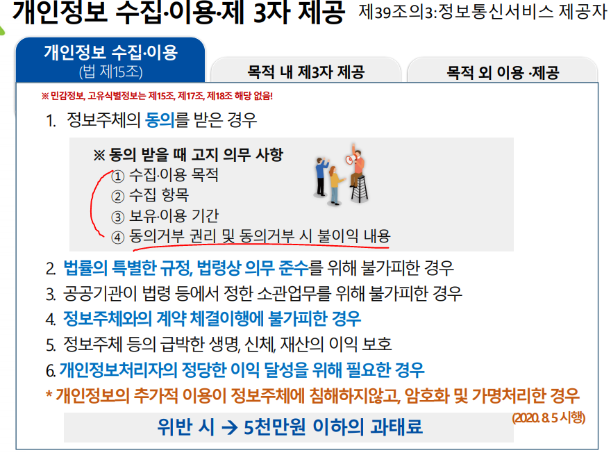 EX) 인터넷 쇼핑에서 주소가 필수 개인정보가 아니다.(물건을 살 수도 안 살 수도 있어서) 따라서 주문 시 주소를 물어 볼 수 있는데 동의를 물어 볼 필요가 없다. 계약 이행을 위한 예외 조항이다.