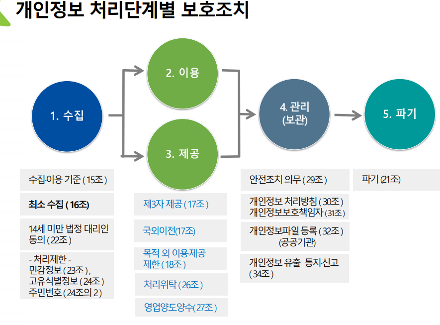 수집 ➔ 이용 ➔ 제공 ➔ 관리 ➔ 파기 사이클로 돌아간다.
