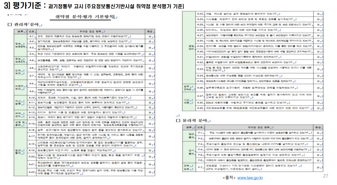 정보보호 사전점검(권고) : 위협, 취약점, 위험 분석 등의(Risk management) 진단을 통해 사전에 취약점을 제거하고 보호대책을 수립