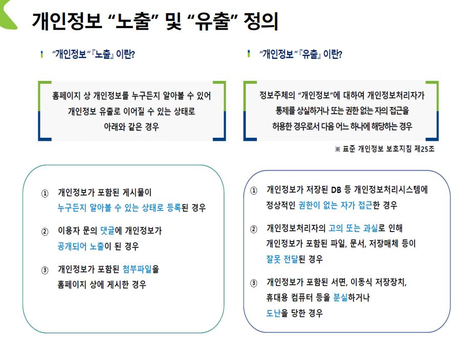법에서는 유출과 노출의 차이를 두고 있지는 않다.(아래 내용은 KISA에서 정의한 것)