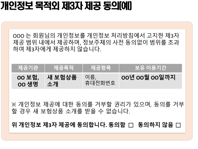 목적 3 제 3자 제공 등 다를 때 목적 부분만 동의란을 따로 만들어 각 각 받도록 만들라는 뜻.